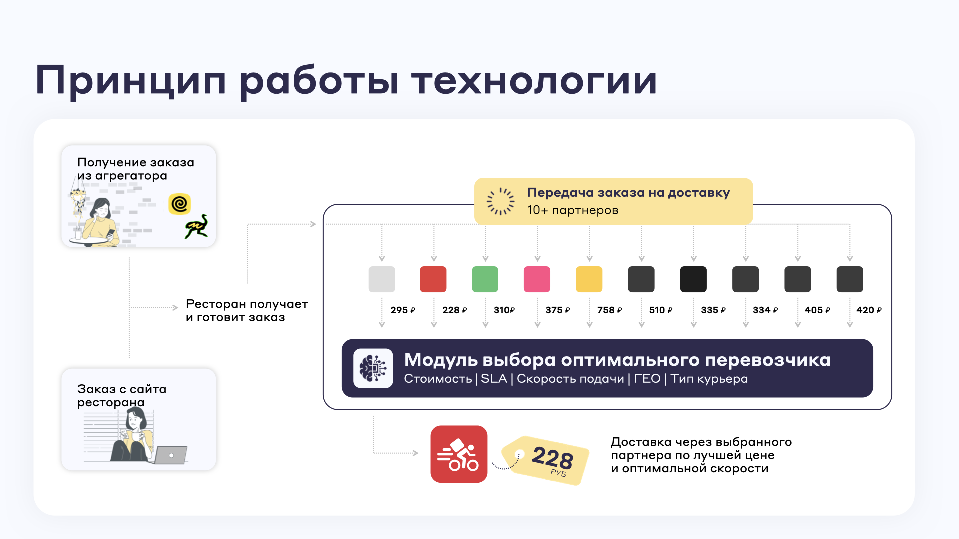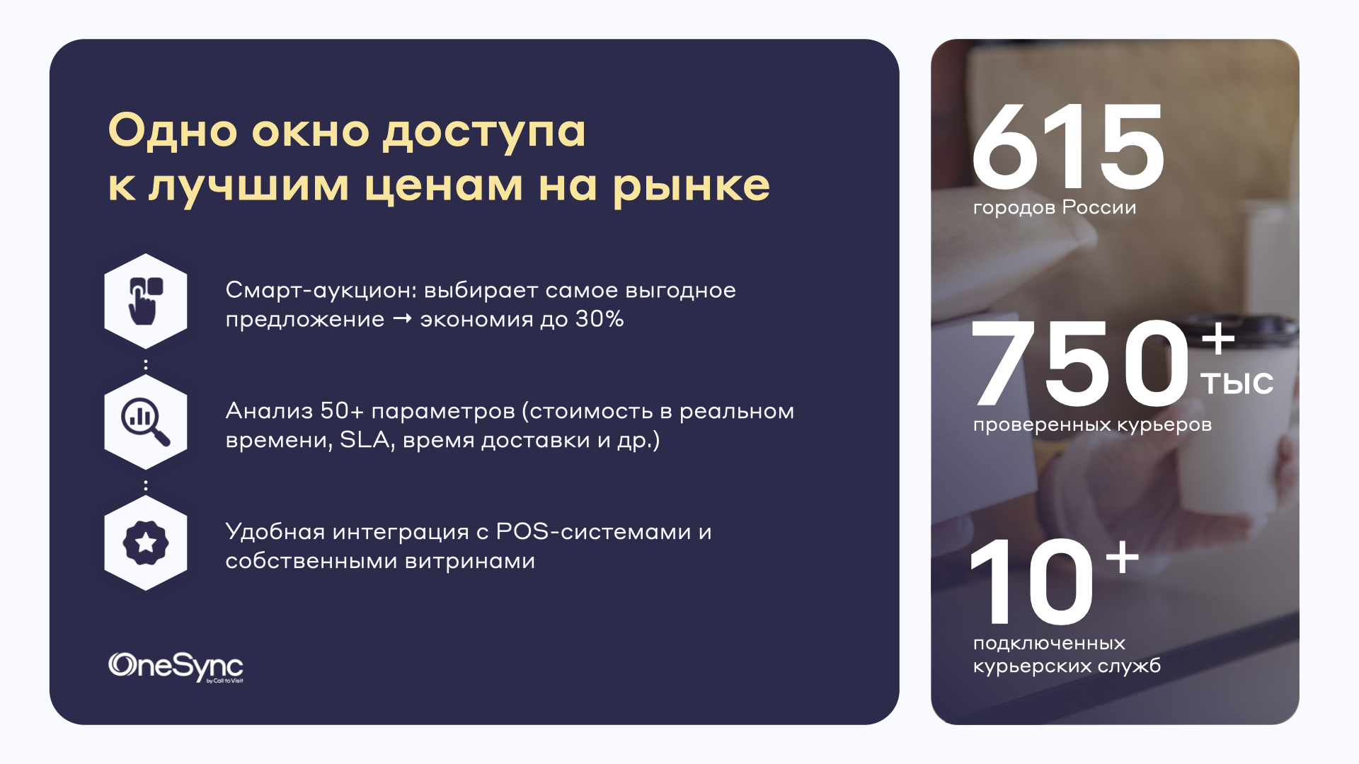 Такие реалии заставляют рестораны искать способы доставлять быстро, но без переплат. Благодаря OneSync by Call to Visit это возможно: единая платформа управления доставкой объединяет более десяти перевозчиков и автоматически выбирает подходящего среди них с учётом цены, скорости и качества.