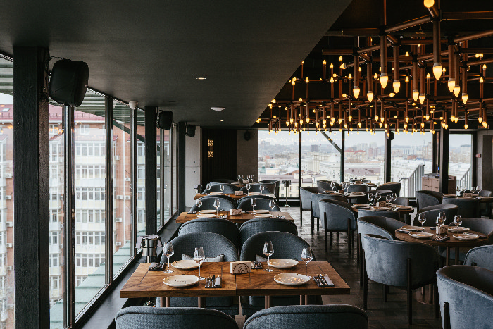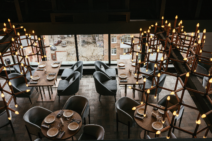 Дизайн выполнен в стиле лофт – в интерьере гармонично сочетаются дерево, металл и натуральные материалы, большое количество света – естественного и внутреннего – позволяют создать особую атмосферу. В ресторане 62 посадочных места, в теплое время года будет работать летняя терраса.