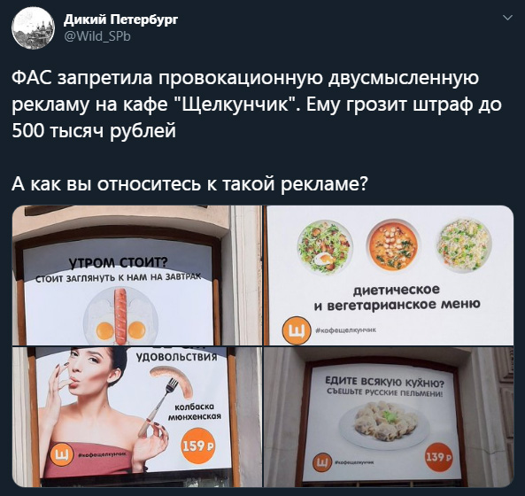 Управление антимонопольной службы по Санкт-Петербургу обнаружило нарушение закона о рекламе в действиях ООО «Династия», управляющего кафе «Щелкунчик» на площади Восстания. Ранее кафе разместило наружную рекламу со слоганом «Утром стоит? Стоит заглянуть к нам на завтрак».