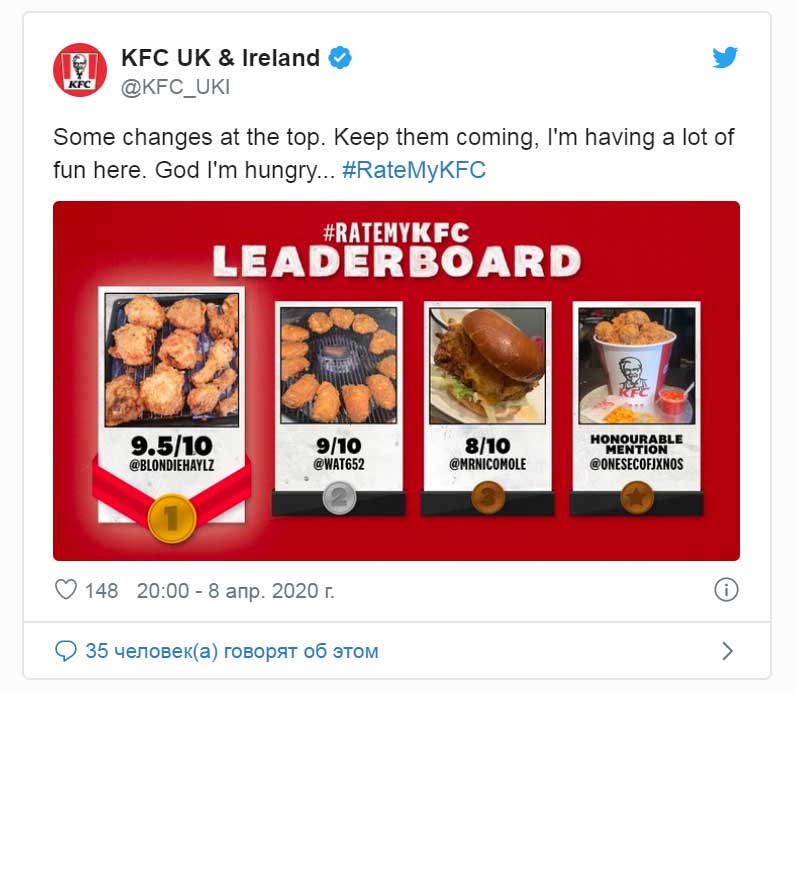 В условиях мировой пандемии многие бренды стараются поддерживать связь с покупателями. Например, филиал KFC в Великобритании и Ирландии устроил конкурс на приготовление своих блюд в домашних условиях. А затем начал издеваться над клиентами, чьи бургеры получились не очень.