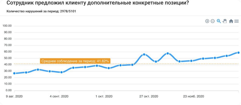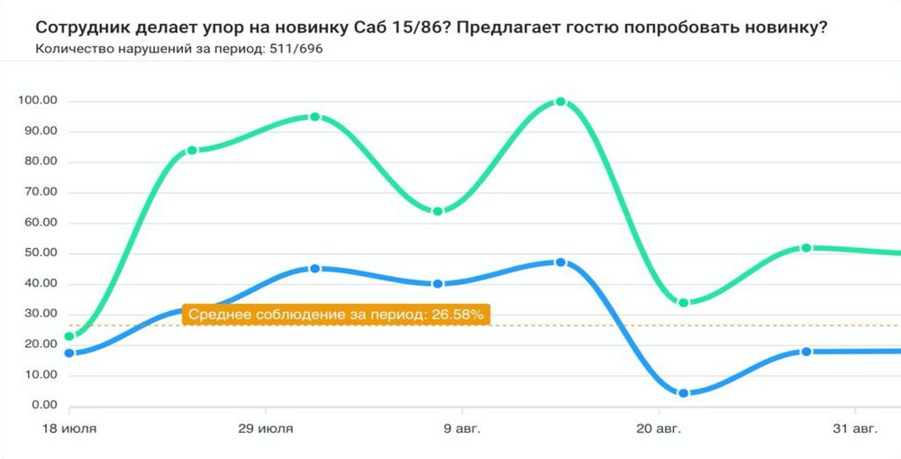Поэтому в SteadyControl вся аналитика уже готова: например, на графике ниже наглядна корреляция продаж и предложения сэндвича в Subway. Продажи растут вместе с предложением – это говорит и об эффективности сотрудников, и о результативной формулировке скрипта.