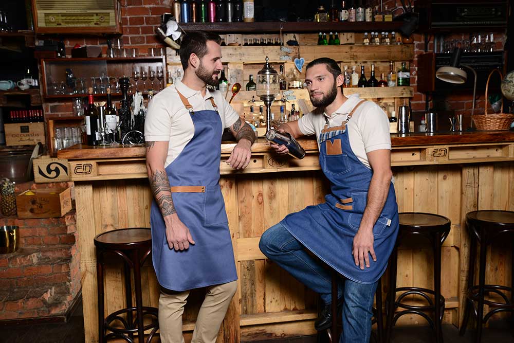 Джинсовые и кожаные фартуки с лаконичными декоративными элементами, мягкие слаксы и поло, и функциональные аксессуары идеально дополнят интерьеры модных баров.