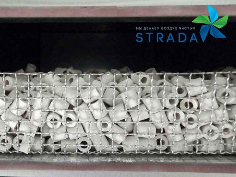 Горизонтальный гидрофильтр работает по следующему принципу. Вода циркулирует по замкнутому контуру, от насоса она подается по трубам к форсункам диаметром ½ дюйма. Форсунки под большим давлением разбрызгивают струи воды на поверхность многослойной массообменной керамической насыпки. В этом месте загрязненный воздух очищается от продуктов горения. Дым, дёготь, сажа улавливаются до 99%, жировой аэрозоль до 90%, частично посторонние запахи. А ещё гидрофильтр-искрогаситель гасит все искры, остужает воздушный поток до приемлемых, безопасных значений. При температуре входящего потока в 400°С воздух охлаждается до 45°С, а при температуре на входе в 200°С – на выходе снижается до 30°С.