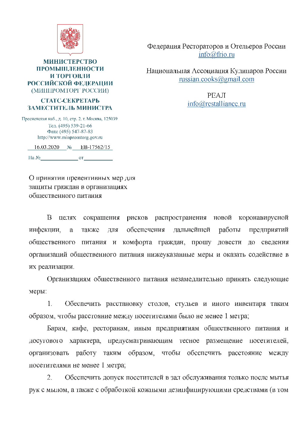 Минпромторг направил в рестораны рекомендации о том, как обезопасить себя и гостей в период пандемии коронавируса