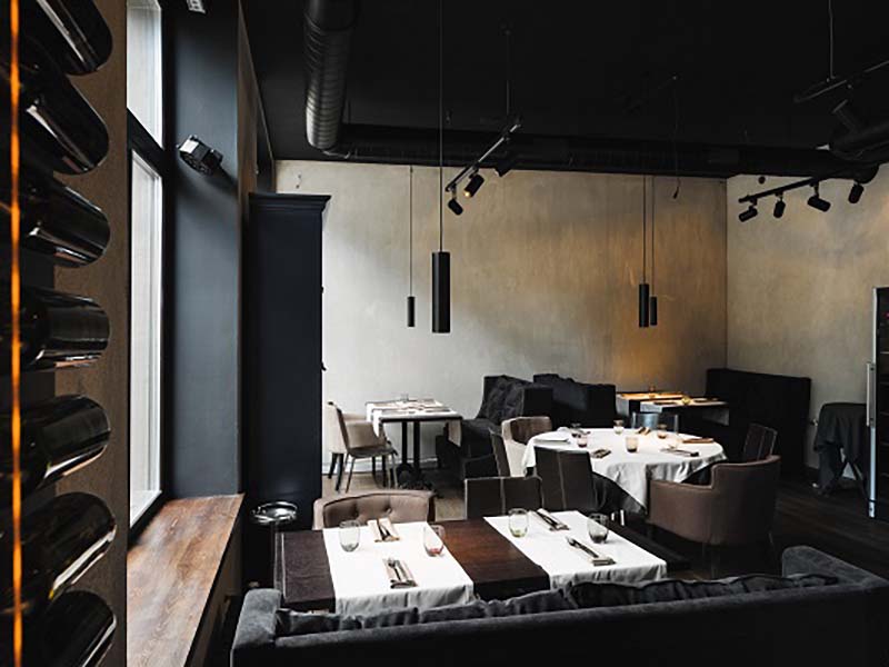 Камерная атмосфера оправдывает название, а интерьер создаёт атмосферу: модные тёмные цвета зала с точечной подсветкой столов призваны сосредотачивать внимание тех, кто зашёл на обед или на ужин, на еде и друг на друге.