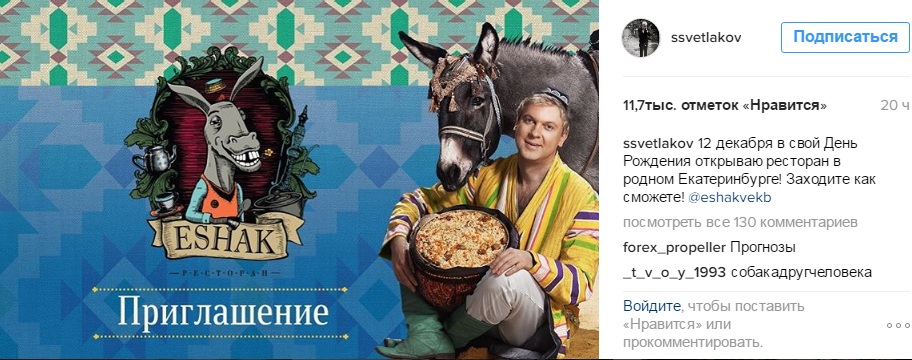 В своем аккаунте Инстаграмм шоумен, актер и ресторатор Сергей Светлаков оставил послание: 12 декабря в свой День Рождения открываю ресторан в родном Екатеринбурге! Заходите, как сможете! Также Сергей Светлаков поделился ссылкой на страницу ресторана в Инстаграмм - @eshakekb. Известно, что рестораны Eshak есть уже в Москве, Алма-Ате и Киеве. Теперь собственный ресторан есть у Сергея Светлакова и в родном Екатеринбурге. С радостным событием именниника поздравили более 130 человек, а отметку "нравится" оставили 11 тысяч подписчиков.