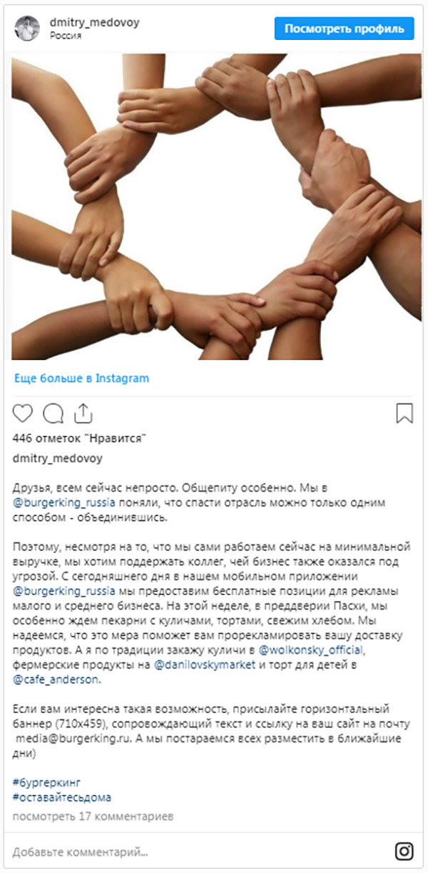 «В это непростое для нашей индустрии время мы хотим поддержать коллег, чей бизнес оказался под угрозой, — говорит генеральный директор «Бургер Кинг Россия» Дмитрий Медовый. — Наша позиция здесь простая: мы за сохранение отрасли, а сделать это можно только объединившись. Поэтому мы начинаем помогать тем, чем можем».