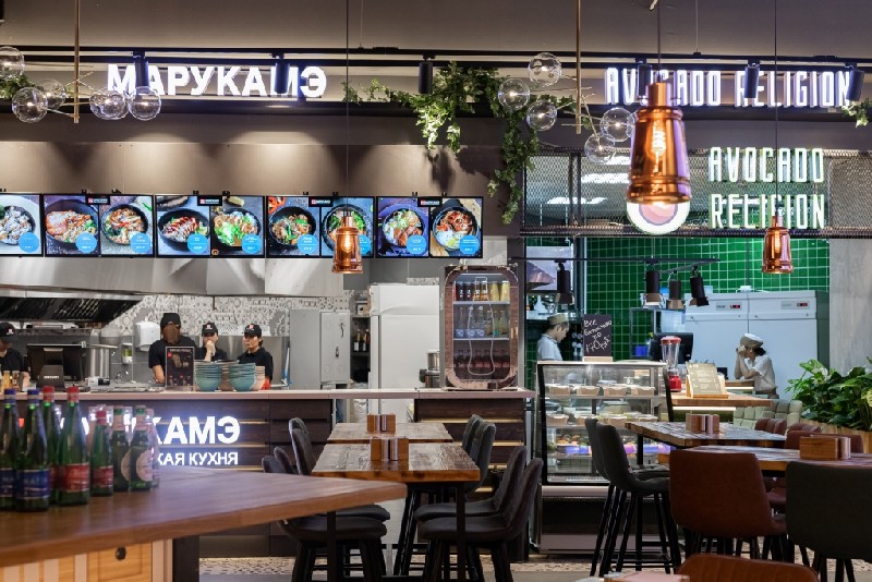 Фуд-холл занимает площадь 500 кв. м и распологается на 3 этаже торгового комплекса.