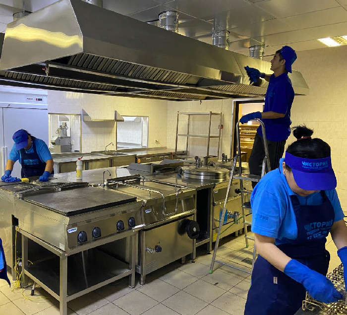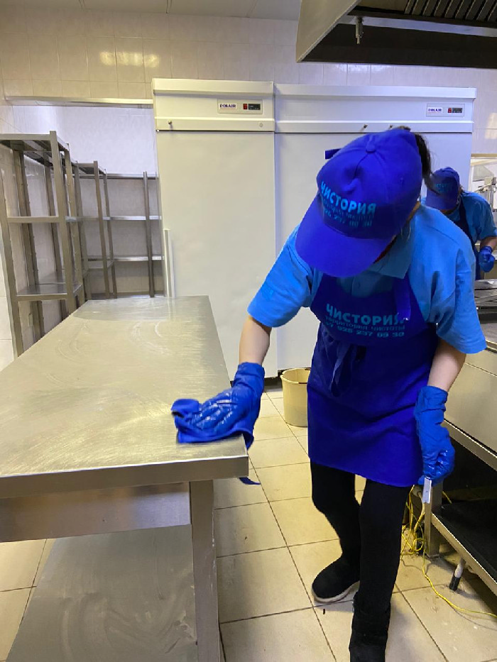 Специалисты клининговой компании «Чистория» поэтапно проводят уборку во всех зонах: зал, служебные и бытовые помещения, кухня.