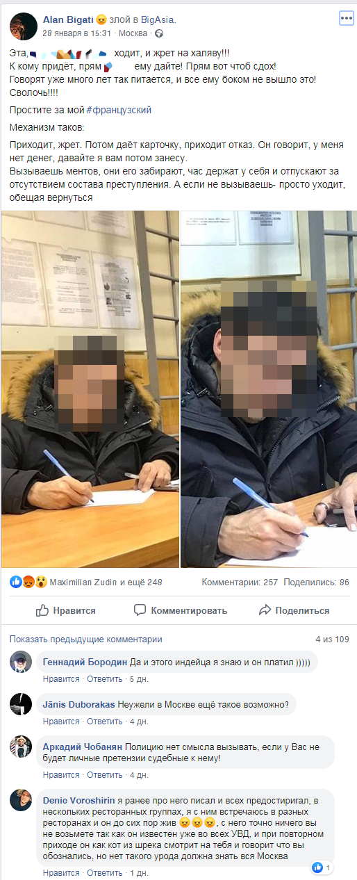 Московские рестораторы задумались о необходимости введения «черных» списков клиентов — заведения сталкиваются с серийными любителями не платить за еду. Эту проблему описал на своей странице в Facebook владелец BigAsia и Bigati Bar Алан Бигати.