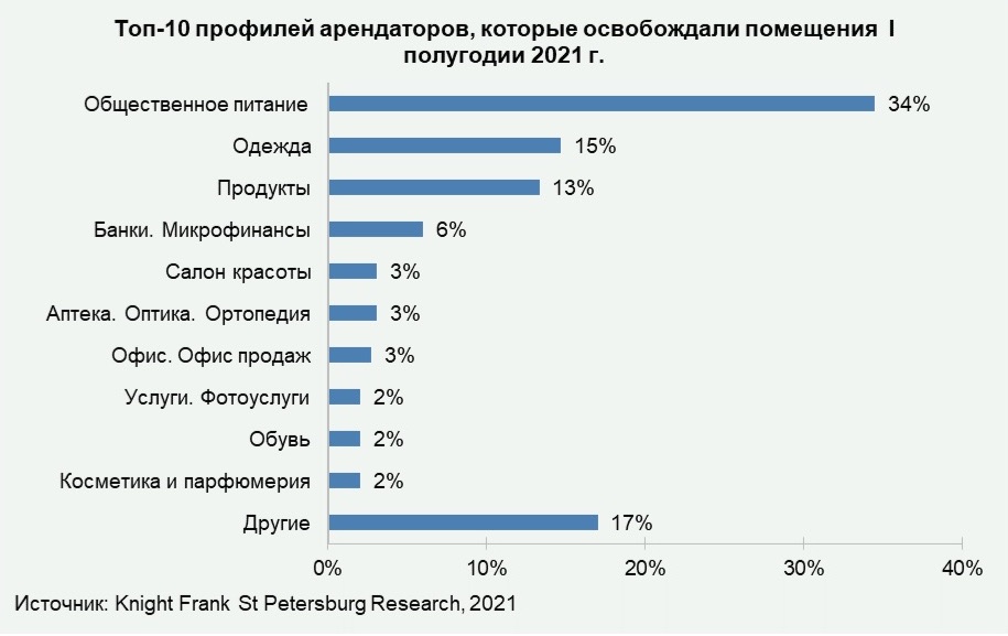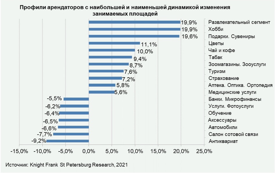Тенденция по оптимизации занимаемых площадей продолжилась в сегменте банков и микрофинансов, где площадь сократилась за I полугодие 2021 года ещё на 5,5% (6% в общей структуре арендаторов по городу), суммарно за год они уменьшили площади на 13,8%. Также салоны сотовой связи сократили площади на 7,7%, магазины аксессуаров – на 6,5%, операторы по предоставлению услуг (фото, ремонт и пр.) – на 6,2%.