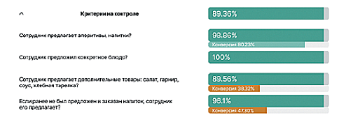 Алгоритмы SteadyControl не просто фиксируют предложение официанта, но и выявляют согласие гостя. Такой показатель в системе называется «конверсия». Так, с системой руководство узнало, что 80% соглашаются на предложение аперитива, а больше половины посетителей – обновить бокал. Таким образом, данные системы позволяют отслеживать результаты сезонных предложений и акций, принимая грамотные управленческие решения.