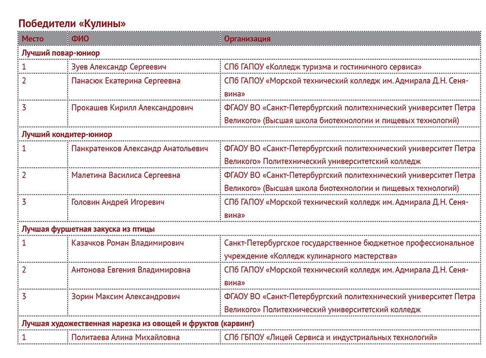 По итогам конкурса вывели победителей по 12 номинациям. Первое место в номинации «Лучший повар-юниор» занял Александр Зуев из петербургского Колледжа туризма и гостиничного сервиса (СПБ ГАПОУ). Лучшим юниор-кондитером признан Александр Панкратенков, представляющий Санкт-Петербургский политехнический университет Петра Великого. Лучшую фуршетную закуску из птицы представил Роман Казачков из петербургского колледжа кулинарного искусства. В номинации «Лучшая художественная нарезка из овощей и фруктов» первое место заняла Алина Политаева, учащаяся Лицея сервиса и индустриальных технологий. В одной из самых вкусных номинаций — «Лучший торт» — победила Полина Климова, представляющая петербургский Колледж кулинарного мастерства. По признанию жюри, лучший пирог испек Ростислав Ставинский, представляющий Колледж ПетроСтройСервис. Лучшей командой по оформлению свадебного стола стали ребята из Санкт-Петербургского Колледжа кулинарного мастерства Владислав Лапин, Андрей Гусев и Илья Жуков.