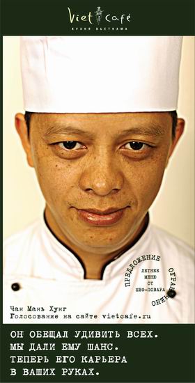 Наконец, рестораторы по-прежнему ищут новые маркетинговые ходы, чтобы привлечь в свои заведения как можно большее количество гостей. Так, первая сеть вьетнамских ресторанов в Москве \"VietCafe\", подготовив специальное летнее меню от шеф-повара Чан Мань Хунга, решила провести голосование - понравится или нет гостям новое блюдо шефа? Главной же интригой такой кампании было то, что если гостям блюдо не понравится, то шеф-повар ни много ни мало увольняется. На дверях заведений сети висел плакат с фотографиями Хунга, на который гости клеили стикеры с оценкой блюда, хотя можно было проголосовать и на сайте. В результате шеф остался: 88,7% посетителей высоко оценили новые блюда.