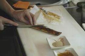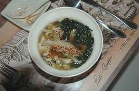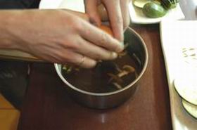 5. Суп перелить в тарелку, сверху выложить нарезанный угорь, максимум 2 г сухих водорослей Вакаме и посыпать кунжутом.