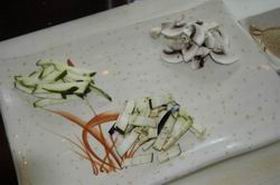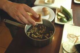 2. В бульон положить нарезанные овощи и грибы. В Японии чаще употребляются грибы Шиитаке, но у нас более популярны шампиньоны.