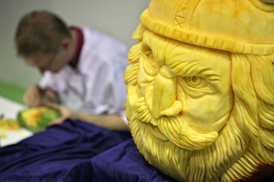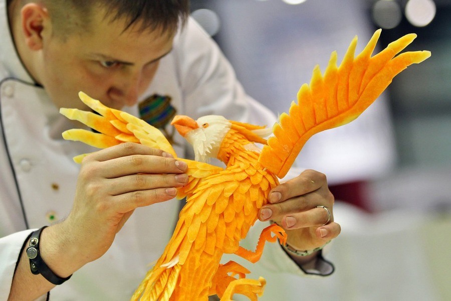 Наши соотечественники выступили на этом конкурсе очень достойно: лучшим мастером по карвингу в Европе оказался представитель России – трехкратный чемпион России по карвингу, обладатель Кубка Кремля и преподаватель Академии Карвинга Вадим Нефедьев. Его виртуозно исполненный орел поразил судей ювелирной детализацией и нестандартным подходом к искусству карвинга. Впрочем, дынный викинг чеха Радека Вача и арбузная японка немца Винифрида Карраса тоже снискали восхищение зрителей. Россияне также разделили серебро с поляками, а третье место заняли немцы.