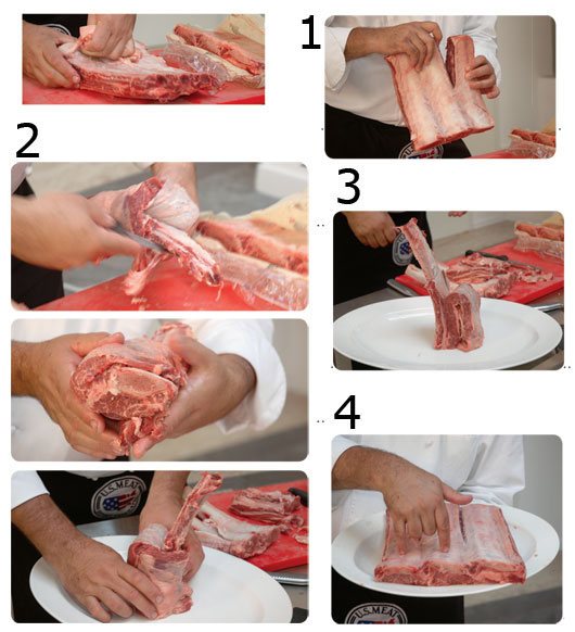 1. В моем ресторане мы просто режем одно ребро вдоль: 1 кость – 1 порция весом 450-500 г. Это большая порция, но половину ее составляет кость.