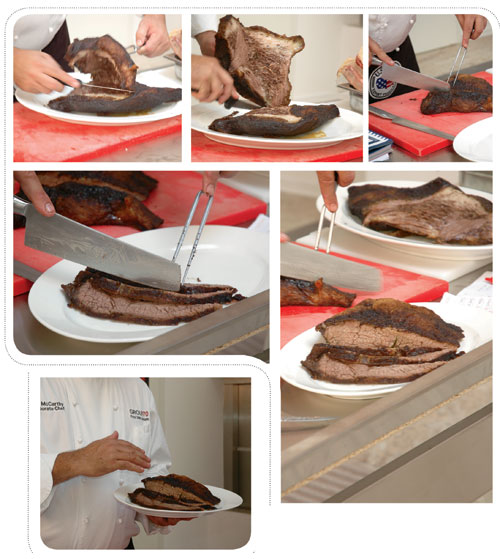 Ее секрет в том, что готовить ее нужно медленно и при низкой температуре: примерно 110оС на 1 кг грудинки в час. Типичный американский отруб грудинки будет весить от 4 до 5 кг – значит, готовить его следует при температуре 110оС примерно 4-5 часов. В Техасе практикуется копчение на дровах, но можно и в пароконвектомате: первые 2,5-3 часа – на прожар, дальше – на жар. Получится корочка. Отруб нужно накрыть фольгой, а когда возникнет необходимость – разогреть, добавив 2-3 см воды: корочка останется.