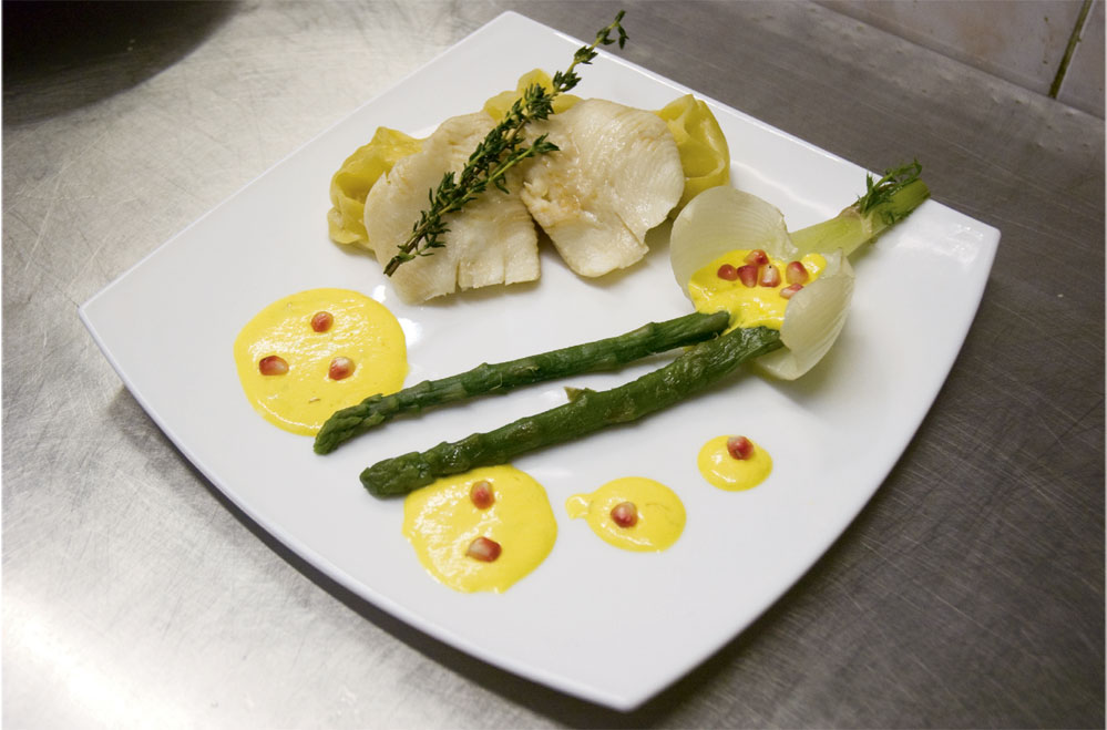 Манты выложить на один из углов квадратной тарелки, рядом положить филе палтуса, украсить веточкой тимьяна. Положить фенхель (его очень важно не передержать на водяной бане!) и спаржу. Полить шафрановым соусом, украсить зернами граната.