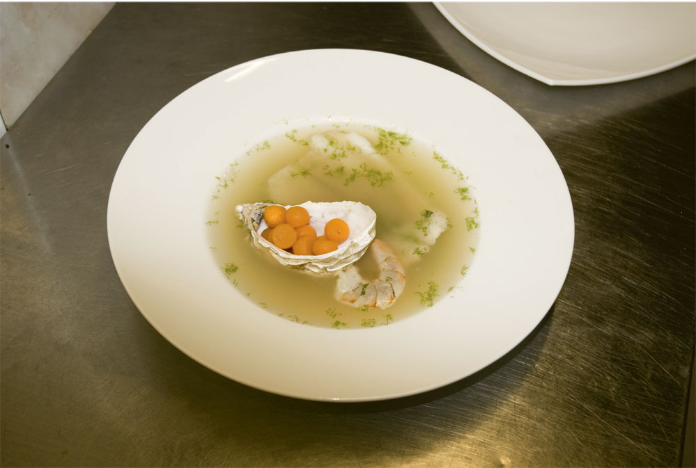 Рыбу для супа вытащить из маринада, отжать и сырой, вместе с тигровой креветкой, положить в глубокую тарелку рядом с устричной раковиной. Блюдо выносится в зал за 40-60 секунд, и так как палтус – рыба очень нежная, - она за это время будет в тарелке доведена до готовности.