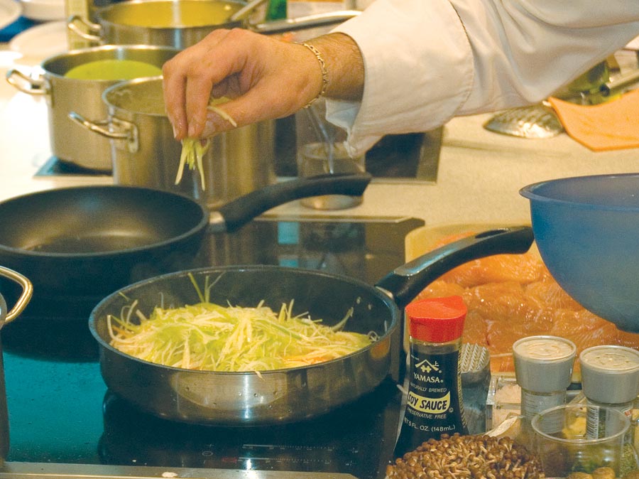 Морской гребешок, являющийся одним из самых дорогих морепродуктов, требует очень бережного обращения. Обжаривать его следует не более двух минут с каждой стороны, аккуратно переворачивая. Томас обжаривает гребешок на лимонном оливковом масле. Солить до обжарки его не стоит – можно просто поперчить.