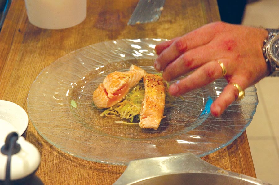Семгу можно взять, конечно, норвежскую, но Томас выбрал местную – русскую. «Совершенство» – возможно, не совсем то слово, которое можно здесь использовать, но маститый шеф хочет им подчеркнуть, что повара не в полной мере пользуются возможностями приготовления этой рыбы. Между тем, способы ее прожарки могут быть ровно такими же, какими мы привыкли пользоваться при приготовлении мяса. В данном случае Томас выбрал семгу прожарки medium rare. Блюдо подается на подушке теплого овощного салата с морским гребешком в шафрановой редукции, украшенным крессом из дайкона. «Это блюдо очень быстрого приготовления, поэтому в нем остаются вкусы всех продуктов», – подчеркивает Томас.