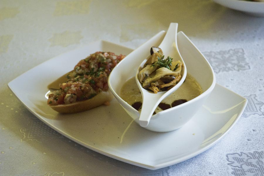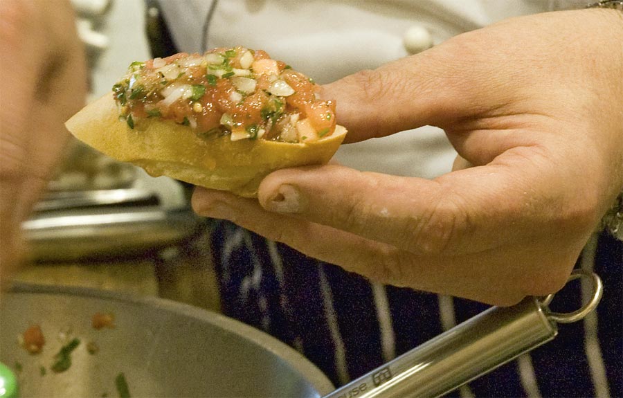 - Что касается брускетты, то очень часто в разных ресторанах мы видим при подаче влажный хлеб, – говорит Томас. – Томаты с маслом и зеленью дают очень много сока, которым пропитывается хлеб, очень быстро размокая. Поэтому прежде чем наполнить ее начинкой, мы должны ее обжарить: тогда на брускетте образуется корочка, которая некоторое время не даст соку проходить внутрь, и при подаче гостю хлеб будет выглядеть аппетитно.