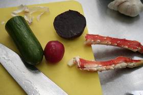 10. Аккуратно вынуть форму, сверху овощей положить мясо краба.