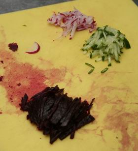 6. Свежий редис очистить от повреждений (но не от кожуры), нарезать соломкой.