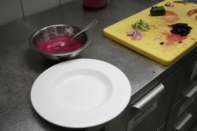8. Нарезанные свеклу, огурец и редис выложить на тарелку через форму.