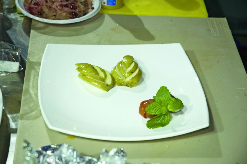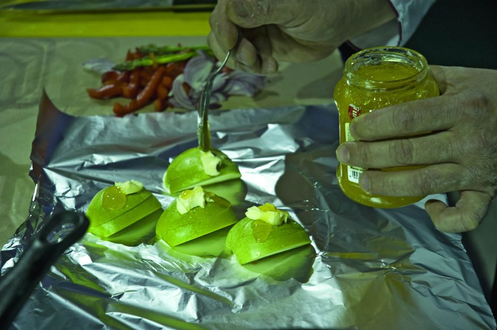 Запечь яблоко. Для этого разрезать его на четвертинки, вынуть сердцевину, поместить на фольгу, немного смазать сливочным маслом (можно использовать и растительное) и полить медом (вместо меда можно взять сахар). Яблоко неплотно завернуть в фольгу и поставить в пароконвектомат с температурой 170оС.