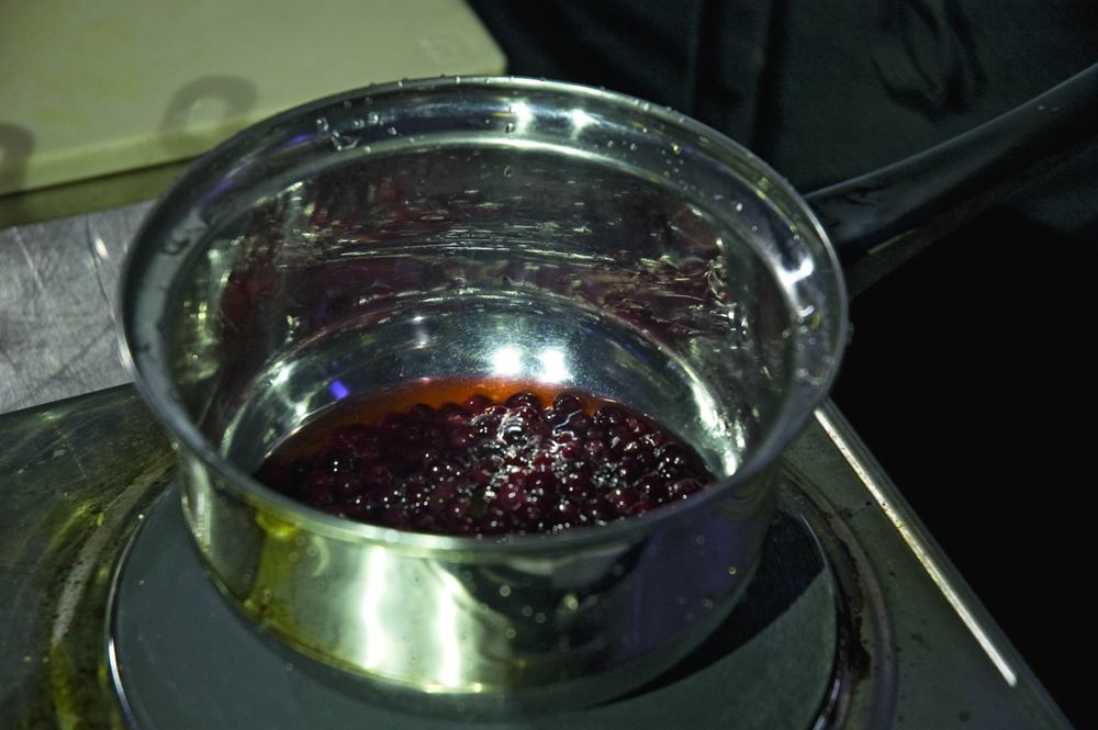 Приготовить брусничный взвар (соус). Для этого положить бруснику в сотейник, добавить уксус (он выступает как консерватор, в том числе цвета). Уксус залить вровень с брусникой, после чего его выпарить. Добавить мед, соус уварить. Пробить в блендере.