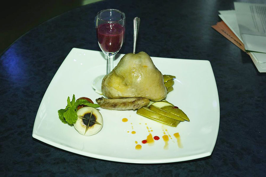 Собрать блюдо. На край квадратной тарелки положить запеченный помидор Черри и чуть подпеченный шампиньон. Украсить листиками мяты. На другой край положить запеченное яблоко. В центр поставить цыпленка, рядом с которым – рюмку с брусничным взваром. Полить растительным маслом с паприкой. На яблоко капнуть выпаренный гренадин.