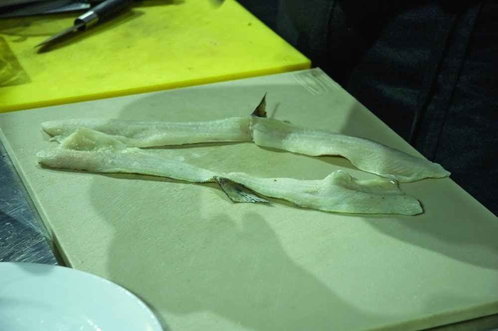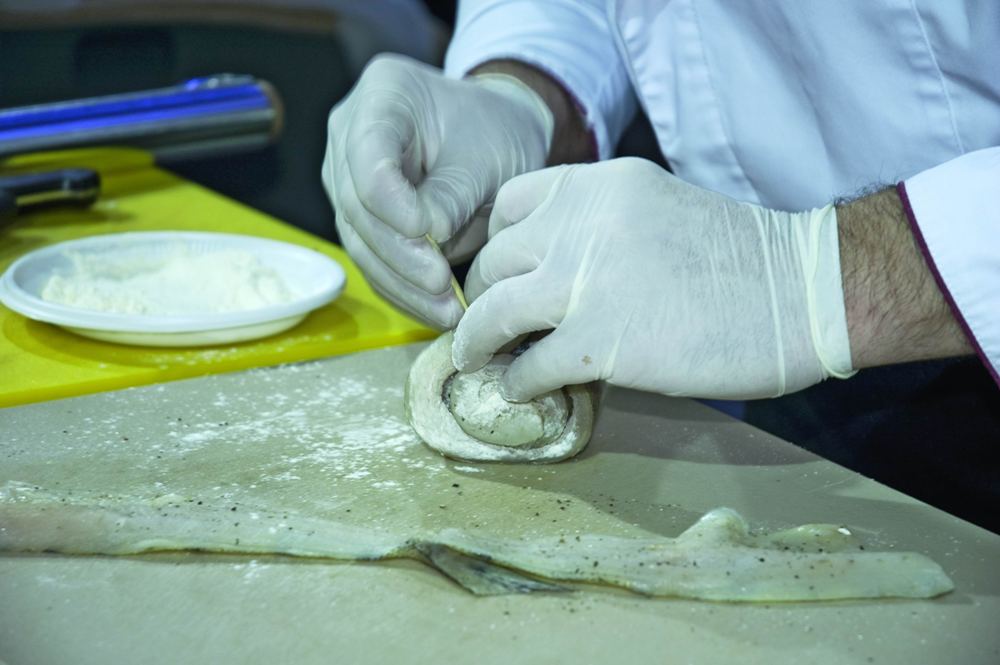 Но особой гордостью русской кулинарии были запеченные блюда: рыба, запеченная под сметанным, белым, молочным, томатным, грибным соусами (взварами), запеканка из икры, рыба, запеченная в тесте и другие. На севере Руси, русском Поморье, широко в ходу была поговорка «безрыбье хуже бесхлебья». Тельное из рыбы подразделялось просто на тельное – из филированной рыбы – и на тельное тяпаное – из филированной рубленой рыбы. В старину оно заворачивалось в тряпочку или марлечку и варилось. Александр готовит для нас исконно русское рыбное блюдо, но – с европейской подачей.