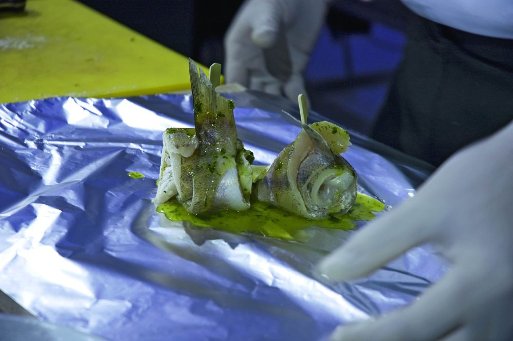 Фольгу обязательно промазать оливковым маслом, чтобы рыба не прилипла, поставить свернутую рыбу и обильно полить заправкой – петрушкой, пробитой в блендере с оливковым маслом. Завернуть неплотно в фольгу, поставить в пароконвектомат с температурой 170оС до готовности.