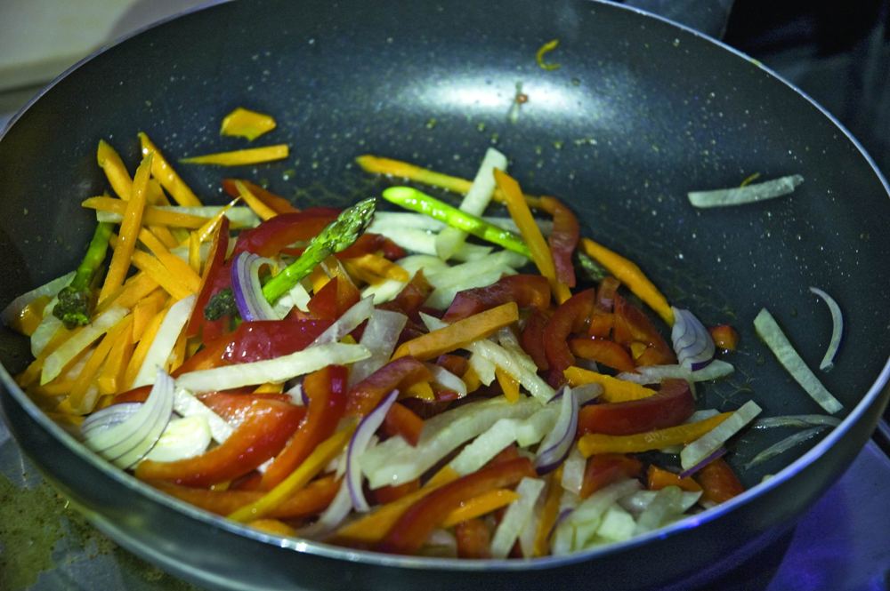 В сильно разогретую сковороду налить оливковое масло, сначала положить морковь и редьку, можно добавить спаржу, предварительно отваренную в течение 30-60 секунд и резко опущенную в лед для сохранения цвета. Когда морковь с редькой станут золотистого цвета, добавить остальные овощи. Для пикантности в гарнир можно добавить винный уксус (или соевый соус), посолить.