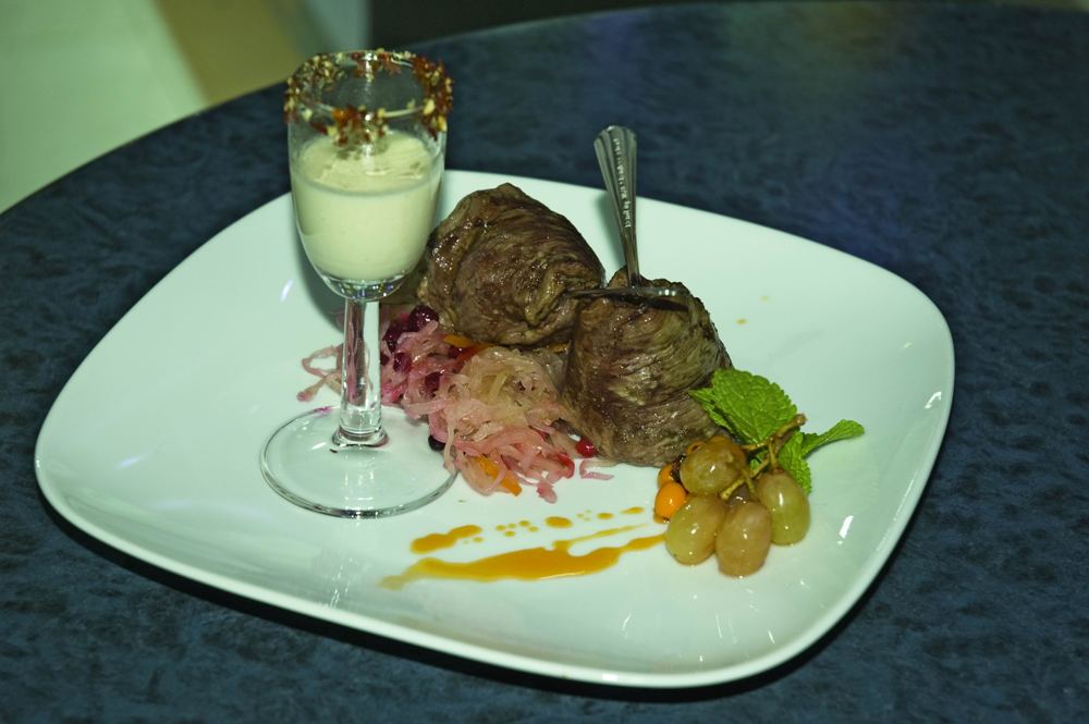 Филе телятины, отбитое предварительно, свернуть рулетом и декорировать ложкой. Немного полить оливковым маслом. Не слоить и не перчить – соль заберет из блюда весь сок: посолить и поперчить можно будет потом. Неплотно завернуть в фольгу, поставить до готовности в пароконвектомат с температурой 170оС.
