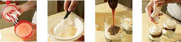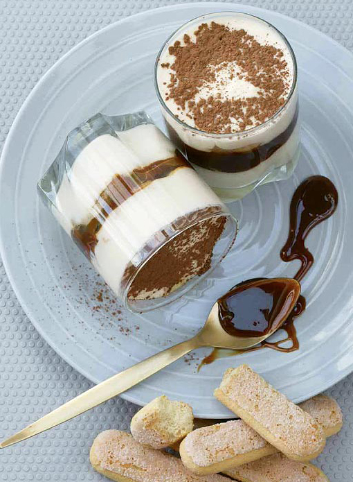 В бокал выложить слоями карамельный крем, поломанные палочки савоярди и яичный крем. Сверху присыпать какао.