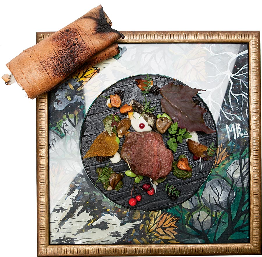 Его новый сет, представленный недавно, также, как это всегда бывает у Ивана, необычный. Он называется «Искусство есть» — торжество зрительных образов и красок. Иван настаивает, что русские продукты по праву могут быть частью искусства. Поэтому, объединившись в творческий тандем с художником, он превращает блюда в полотна, которыми можно любоваться как настоящим шедевром. В основе, разумеется, локальные продукты: союз рябины и утки с черным хлебом, сочетание телячьей щечки, лесных грибов с козлобородником, лесные грибы и кизил с травами. Конечно, Березуцкий не мог пропустить такое событие как ПИР и проект «Русская кухня — новые горизонты». И представил там свое блюдо — свое видение русской кухни. Специально для нас он провел мастер-класс по приготовлению этого блюда.