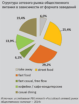 Следует констатировать, что фаст-фуд — сегмент быстрого питания — является сегодня основным двигателем российского сетевого рынка: этот сегмент показывает наиболее высокие темпы развития, на него приходится 47,5% всех открытий (см. диаграмму «Структура сетевого рынка общественного питания в зависимости от формата заведений»). В России с марта 2013 года по апрель 2014‑го было открыто около 1500 новых ресторанов, среди которых 727 являются заведениями быстрого питания. Это неудивительно: столь стремительному росту фаст-фуда способствует рационализация россиян, выражающаяся в стремлении к экономии и снижении затрат, в том числе и в питании вне дома.
