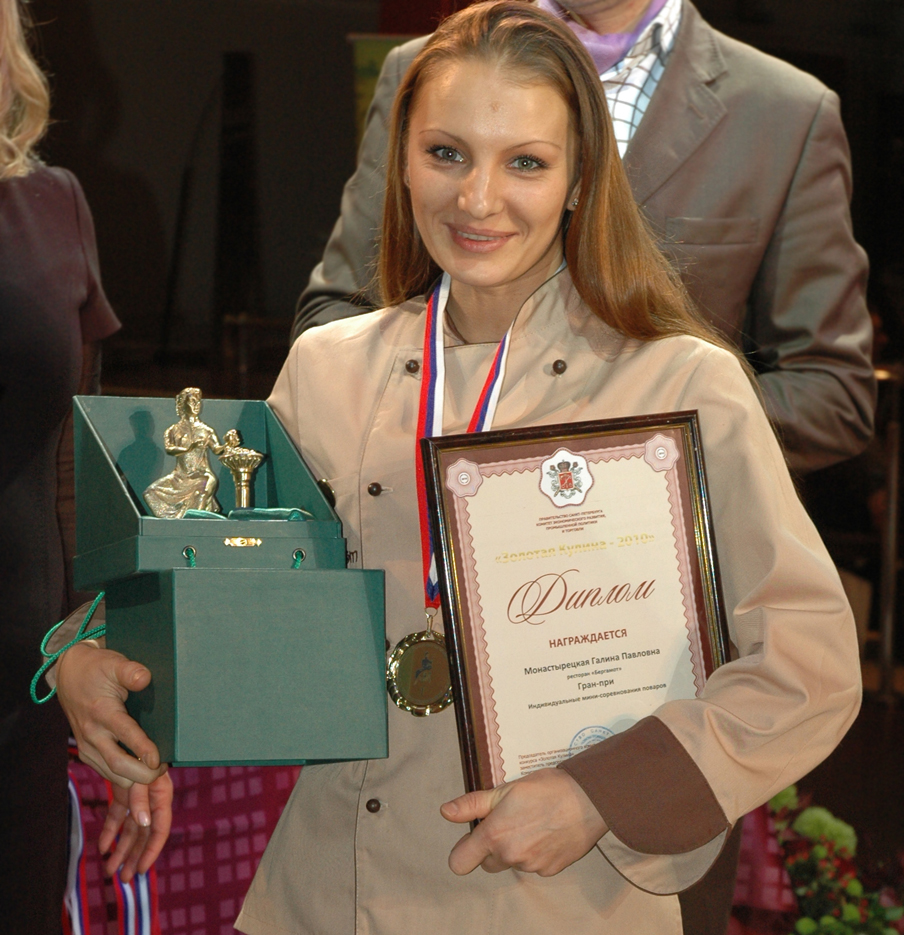 — Я уже 10 лет в поварской профессии, — говорит Галина Монастырецкая, су-шеф ресторана «Бергамот», — и два года из них в «Бергамоте» — со дня открытия. Мне очень приятно, что Гран-при досталось нам — именно нам, потому что мы, два су-шефа и шеф-повар ресторана, называем себя командой, и это победа всей нашей команды, всего нашего ресторана!