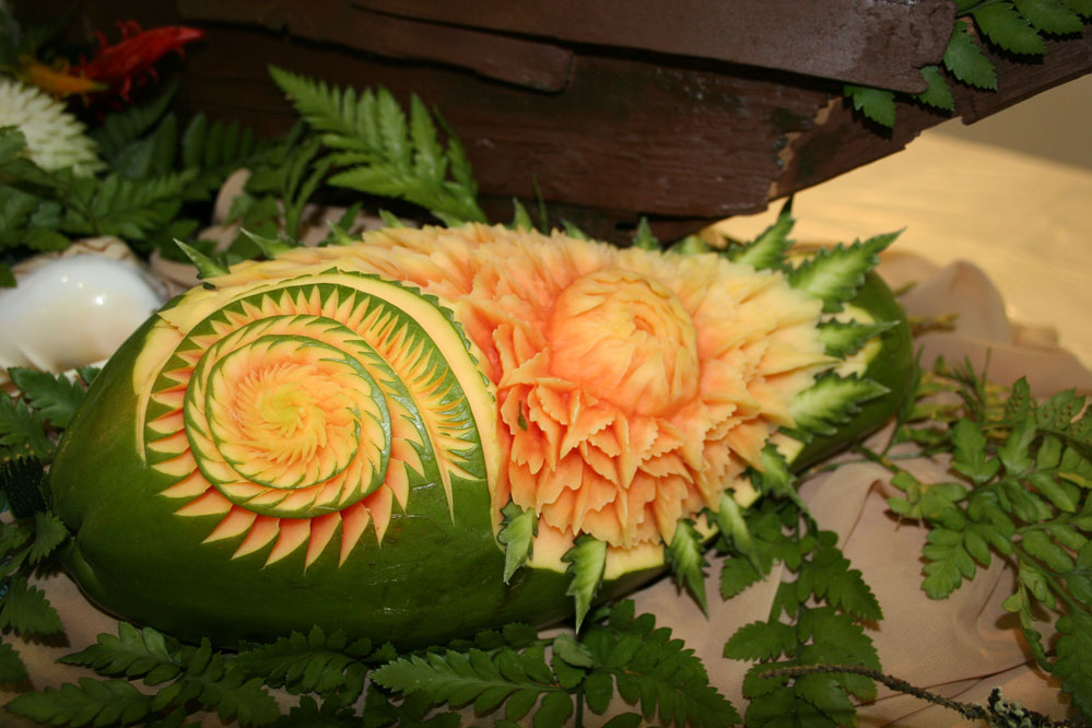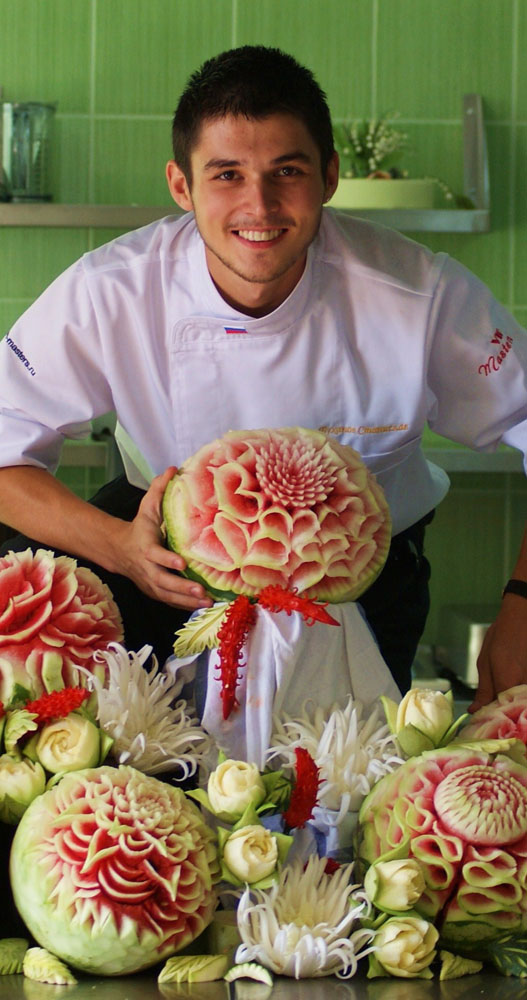 — Профессия карвингист, несомненно, есть: это человек или группа людей, которая занимается оформлением банкетов в гостиницах или в кейтеринговых компаниях. Есть и независимые карвингисты, работающие по заказам. Но карвинг, на мой взгяд, — это все же неотъемлемая часть профессии повара, потому что любой шеф-повар должен знать простейшие элементы украшения банкета или блюда. Ведь при заказе гостем ресторана фруктов, их не должны выносить на тарелке просто помытыми — нужно красиво нарезать. А как можно нарезать, чтобы гость удивился? Думаю, ответ напрашивается сам собой.