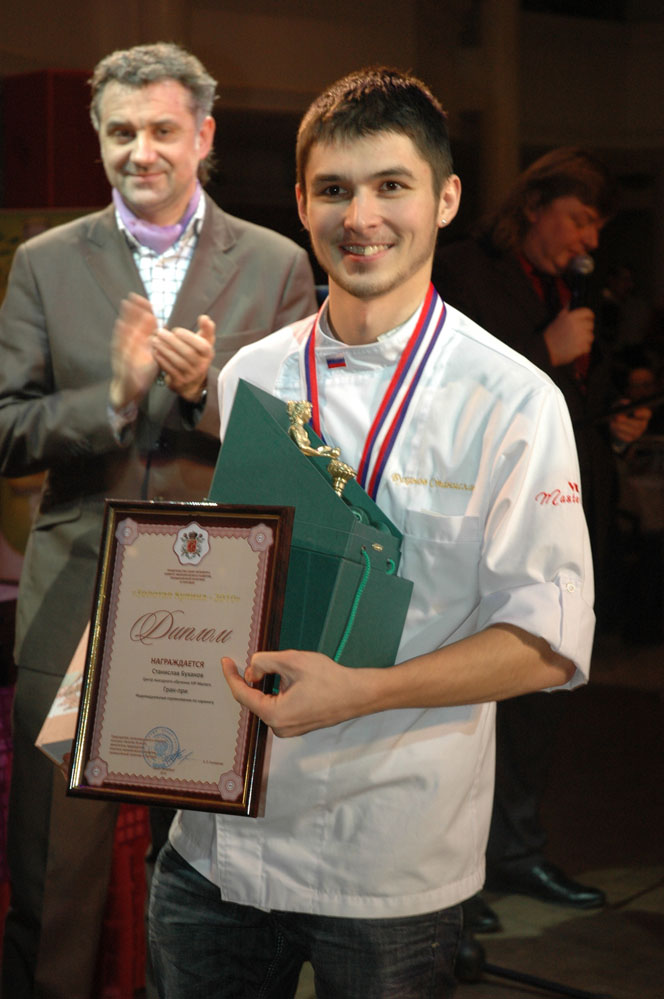 На проходивщем в Санкт-Петербурге Международном чемпионате «Золотая Кулина» в этом году этот человек своей открытостью и улыбкой очаровал всех — любопытствующих гостей, строгих судей и даже настороженных коллег, которые поначалу просто внимательно присматривались к тому, что же творит на соревнованиях по карвингу эта московская птица, а потом внимание удвоили: посмотреть было на что! Станислав Буханов, ведущий преподаватель по карвингу, аэрографии и вегетарианской кухне Центра высшего кулинарного мастерства VIP-Masters, многократный чемпион российских и международных конкурсов, работал азартно, весело и очень профессионально. Поэтому никто не удивился, когда ему вручили сначала одну золотую медаль — за победу в номинации Карвинг, потом другую — за победу в номинации Яблочный карвинг, а следом и Гран-при — за победу в индивидуальных соревнованиях по карвингу.