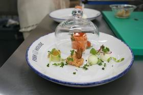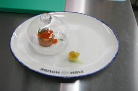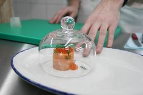 5. Рыбу с икрой и укропом накрыть сверху куполом. Этот стеклянный купол ручной работы выполнен специально для ресторана «Эгоист». Он пригодится потом, когда Влад будет запускать внутрь купола дым.