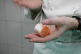 2. Свернуть готовое филе лосося рулетом, поставить на блюдо. Принципиально важна подача в определенной тарелке прямоугольной формы — как объясняет повар, это норвежская тарелка, придающая всему блюду скандинавский стиль. Ее можно посмотреть на оригинальной фотографии с конкурса Bocuse d'Or.