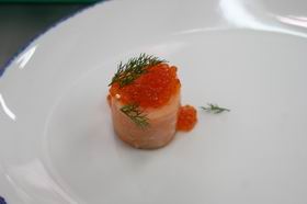 — На конкурсе я готовил лосось в три слоя — сначала мусс, а внутри краб, — здесь, конечно, подача упрощена, — рассказывает Владислав Дьячук. — Кроме того, там я подавал его с молодой хвоей — она немного кислит, и в этом ее прелесть, это именно то, что должно было быть. Сейчас мы заменили ее укропом.
