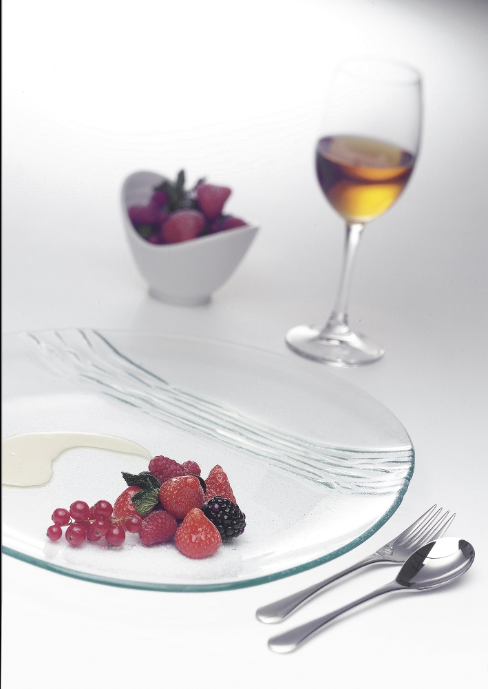 Чаще всего для подачи десерта выбирают тарелку большего размера, нежели стандартная 15-20 см, так как в этом случае подачу можно декорировать рисунком из сиропов, фруктами, шоколадом – как пожелает повар. Эффектно смотрится десерт с мороженым на стеклянной тарелке (еще одна популярная форма подачи). Стекло может быть как прозрачным, так и матированным, цветным. Что касается рисунка, то это обыкновенно небольшой, лаконичный логотип заведения – это практично и стилистически не мешает декоративному оформлению самого десерта, ведь чаще всего он сам по себе уже является ярким пятном на блюде.