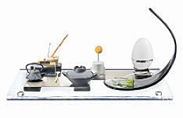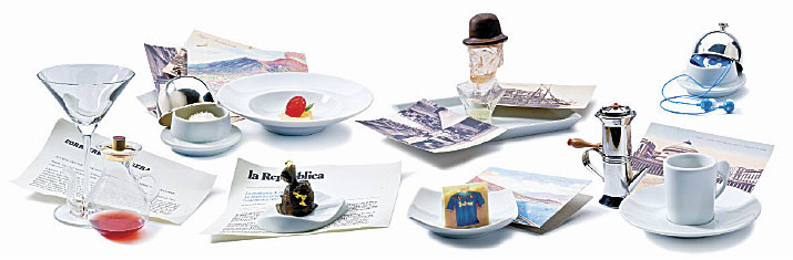 — Он означает пакет с мусором. К сожалению, Неаполь — очень загрязненный город, и мусор в последние годы тоже стал его своеобразным символом. Чтобы показать, что мусор — это ценность, которая разбросана у нас под ногами, я положил на шоколадный пакет золотой листик. Конечно, он тоже съедобный. Начинка «пакета» — струффоли, местная неаполитанская сладость, которую едят в Рождество и на Пасху. За «пакетом с мусором» и «кровью святого Януария» мы видим тарелку с красно-желтым десертом, рядом с которой стоит блюдо с чем-то белым. Классическое традиционное блюдо Неаполя — спагетти с помидорами и сыром пармиджано. Собственно, это оно и есть. (Улыбается.) Спагетти — из лимонного желатина, «помидор» — это малинка, а «сыр» в сырнице — кокосовая стружка.