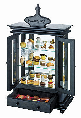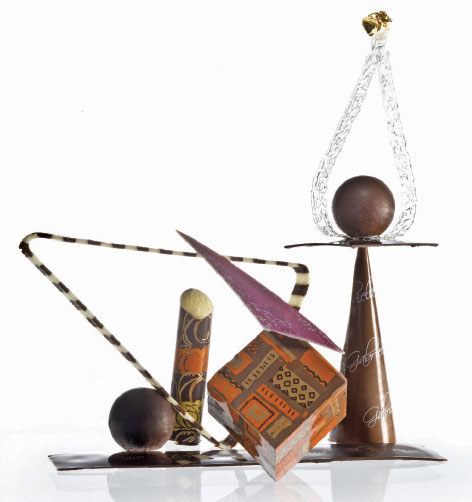 — Многие. Вот, например, десерт, который выглядит очень странно. Он весь выполнен из шоколада, а сделан в честь хозяйки отеля «Манци» Габриэлы и так и называется: «Сладкая Габриэла». В кубе на переднем плане — торроне: местное типическое пирожное на меде. В конусе — очень крепкий лимонный ликер из города Беневенто в регионе Кампания, чьей столицей, собственно, и является Неаполь. В одном шаре — дистиллят местного яблока, которое срывают фактически зеленым, кладут на солнце и потихоньку поворачивают: оно становится от солнца красного цвета. В другом шаре — мороженое из буйволиного молока, которое тоже является местным неаполитанским продуктом. А в шоколадном столбике на заднем плане – орешки из зоны Беневенто. Поэтому даже если формы моих блюд очень странные, концепцией все равно остается территория. Вот, например, шкатулка со сладостями: в ней собраны все типичные, традиционные сладости Неаполя.